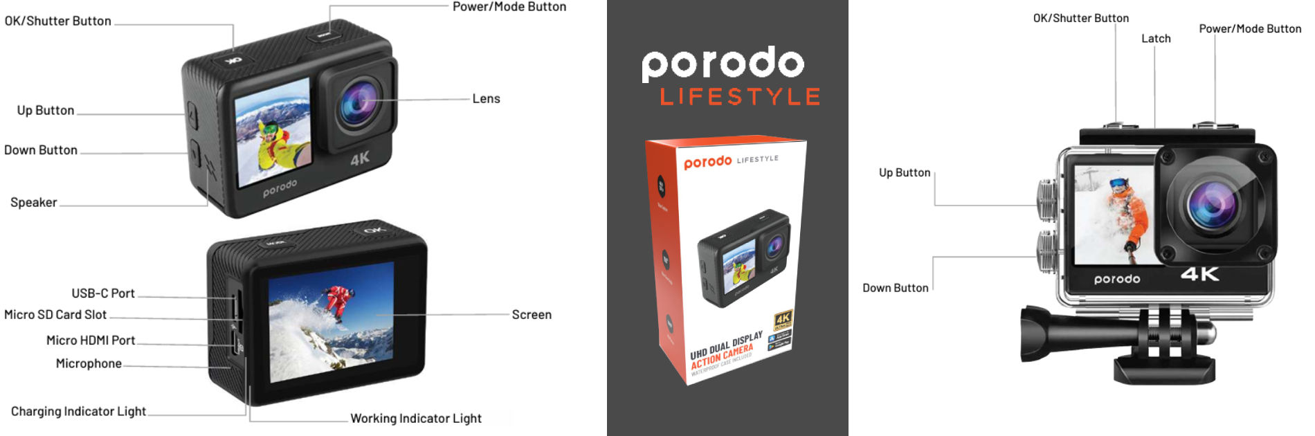 Porodo Lifestyle Waterproof 4K Action Camera 900mAh PD-4KACAM-BK (Black)